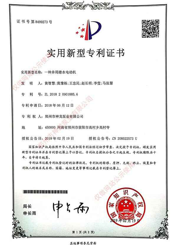 井用潜水电动机专利证书